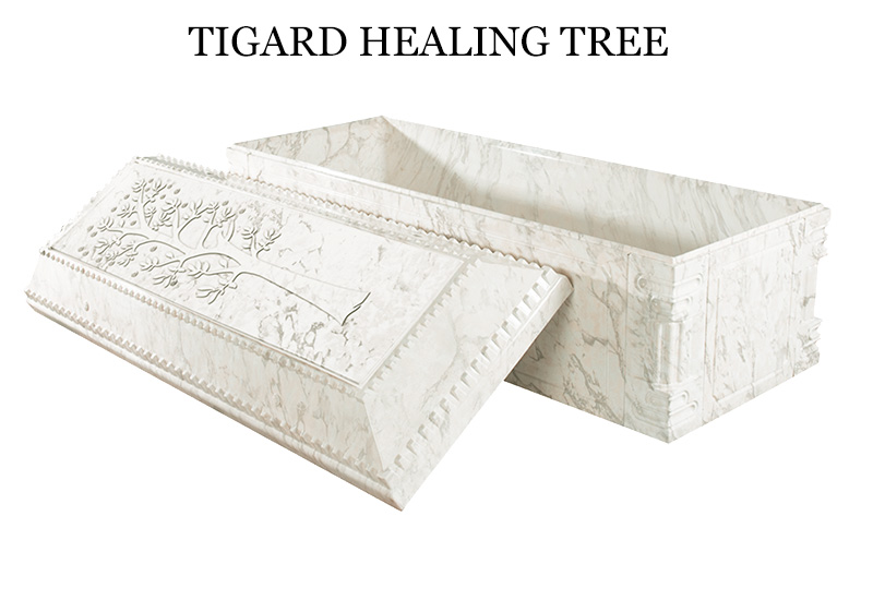 | Exterior Features | Totally encased in matching white marble polymer liner with optional healing tree raised carapace that include 20 keepsake memory rings. |